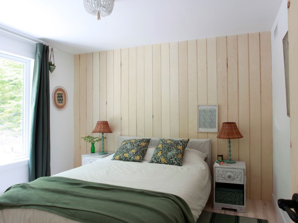 Whether you’ve got pine paneling on the wall or ceiling, or are lucky enough to have log walls, nothing will be cozier than wood. However, that’s an expensive thing to add to a decor. Rather, make the smart choice and integrate it to the space with mock beams, wooden doors and furniture. Make sure the wood colours match. Some might prefer a white finish (the famous shiplap) for that farmhouse look. If that’s the option you want, you can save some money by buying painted MDF laths. If you want real wood, but don’t want to pay for the more expensive species (maple, oak), choose pine, a soft wood and the least expensive option, and stain it to hide its yellow tint. For our bedroom, I chose wide laths of Russian cherry plywood, a product distributed by Interbois, and which offers another alternative to solid wood at a more affordable price.